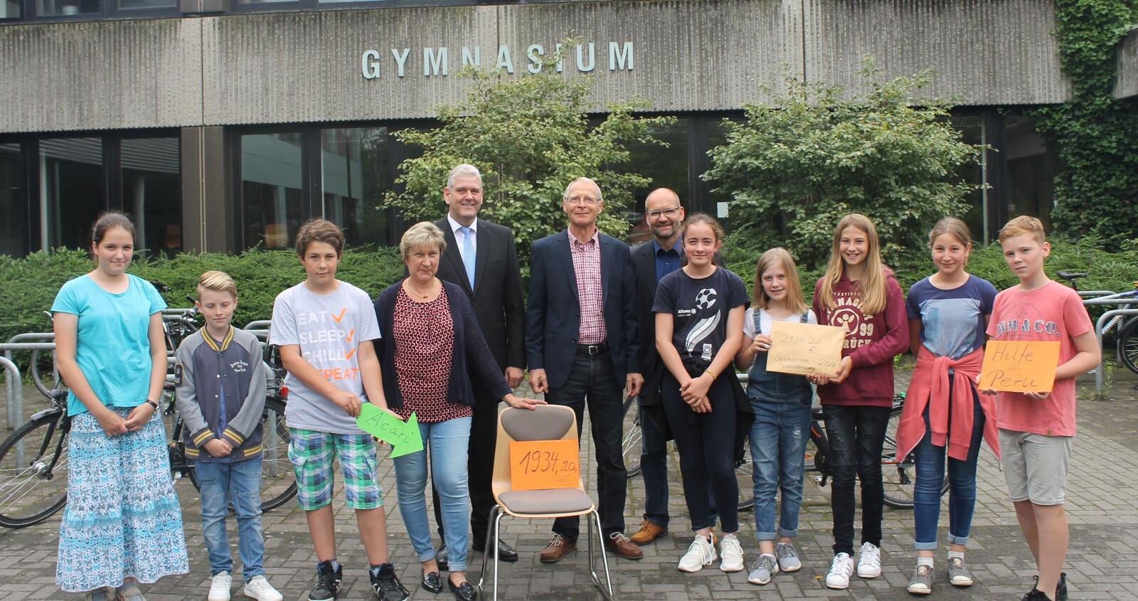 Weiter mit auf dem Bild: 4. von links: Uta Hoischen, die diese Aktion geplant und durchgeführt hat 6. von rechts: Leiter des Gymnasiums Herr Gringard