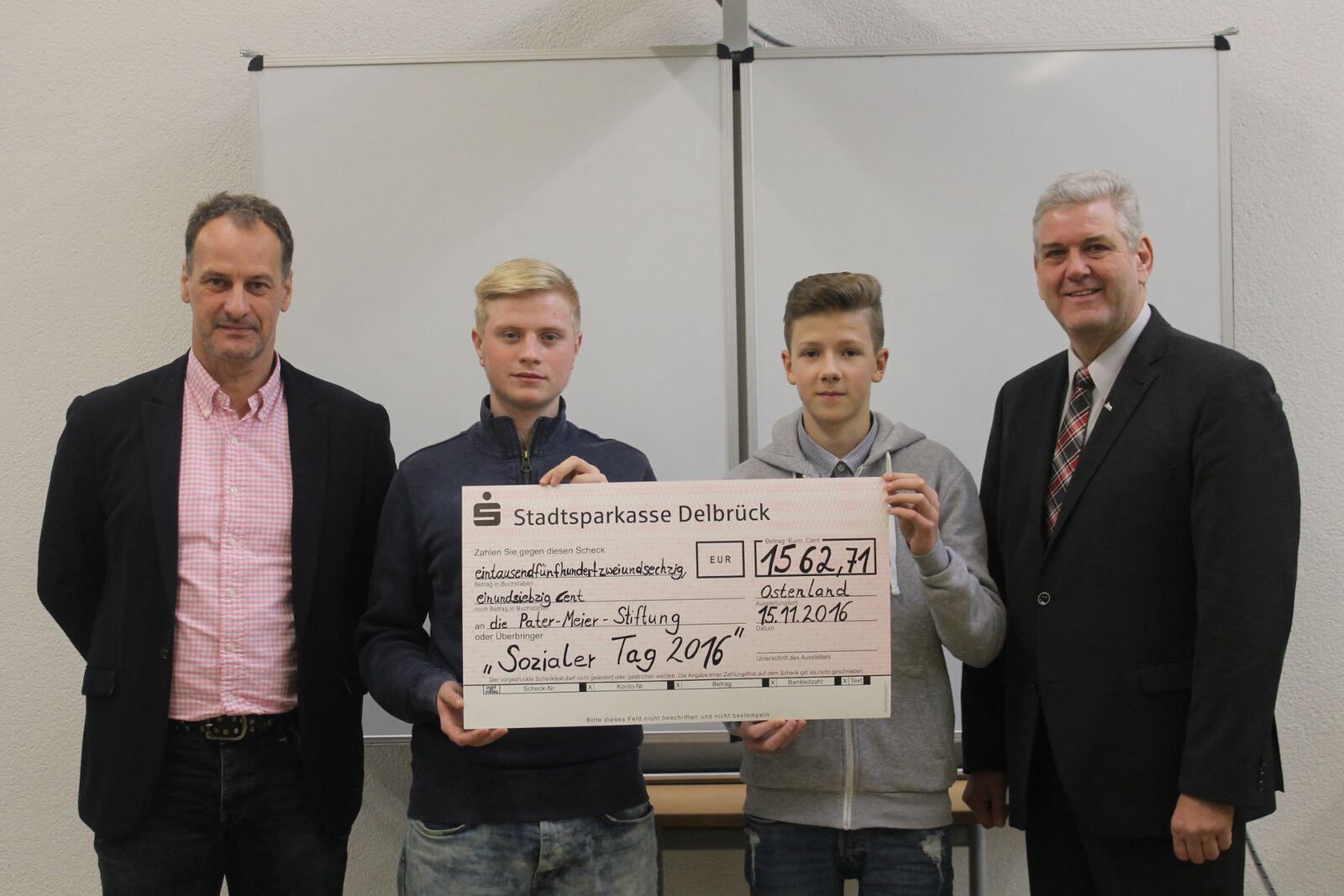 Bereits zum siebten Mal führte die Hauptschule Ostenland den "sozialen Tag" durch und sammelte so Spendengelder. Insgesamt 1.562,71 EURO sind in diesem Jahr zusammen gekommen. Diese stattliche Summe hat nun der Schulleiter, Oliver Austenfeld, gemeinsam mit den beiden Schülersprechern Joel Neh und Lukas Brom an den Vorsitzenden der Pater-Meier-Stiftung, Bürgermeister Werner Peitz, übergeben. Am "sozialen Tag" tauschen Schülerinnen und Schüler ihren Platz in der Schule gegen einen Arbeitsplatz, den sie sich selber suchen. Das kann z. B. in der Kita, im elterlichen Betrieb aber auch als Haushaltshilfe bei Nachbarn oder Großeltern sein. Der dadurch erarbeitete Lohn wird als Erlös an die Pater-Meier-Stiftung gespendet. In diesem Jahr haben sich mehr als 90 Prozent der Schülerinnen und Schüler um einen Tagespraktikumsplatz gekümmert und Erfahrungen in den verschiedenen Tätigkeitsbereichen gesammelt. Mit dem sozialen Tag übernehmen die Jugendlichen schon früh Verantwortung und lernen, sich für soziale Zwecke zu engagieren. Um eine größere Identifikation mit den Zielen des sozialen Tages zu erreichen, spendet die Hauptschule Ostenland an die hiesige Pater-Meier-Stiftung. Diese Stiftung unterstützt Projekte in Peru wie z. B. den Aufbau von Schulen und die Ausbildung junger Menschen. "Ich bedanke mich ganz herzlich bei allen Schülerinnen und Schülern SuS für ihren sozialen Einsatz für andere Menschen, der nicht selbstverständlich sondern vorbildlich und beispielgebend in unserer Zeit ist.", bedankte sich Bürgermeister Werner Peitz. Mit den Spendengeldern werden an der Schule in Acari (Peru) Maschinen und Werkzeuge für den technischen hauswirtschaftlichen Unterricht angeschafft.